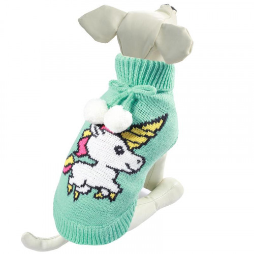 Описание: Теплый и оригинальный свитер с изображением единорога - это удобный и функциональный аксессуар для собак, который просто незаменим в холодную погоду. Изделие защитит вашего питомца от ветра и согреет в непогоду. Свитер имеет стильный дизайн, а универсальный фасон не стесняет движений питомца во время прогулки. Вывязанная резинка по всему периметру низа изделия обеспечивает плотное прилегание свитера к телу, ворот украшен помпонами. Такой свитер с модным принтом станет украшением гардероба вашего питомца. Материал: акрил. Цвет: мятный. Размер: 25см (S).